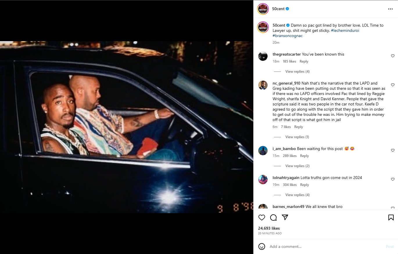 50’s post included a photo of 2Pac and Suge Knight sat in the black BMW sedan the night of the deadly drive-by shooting on September 7, 1996.