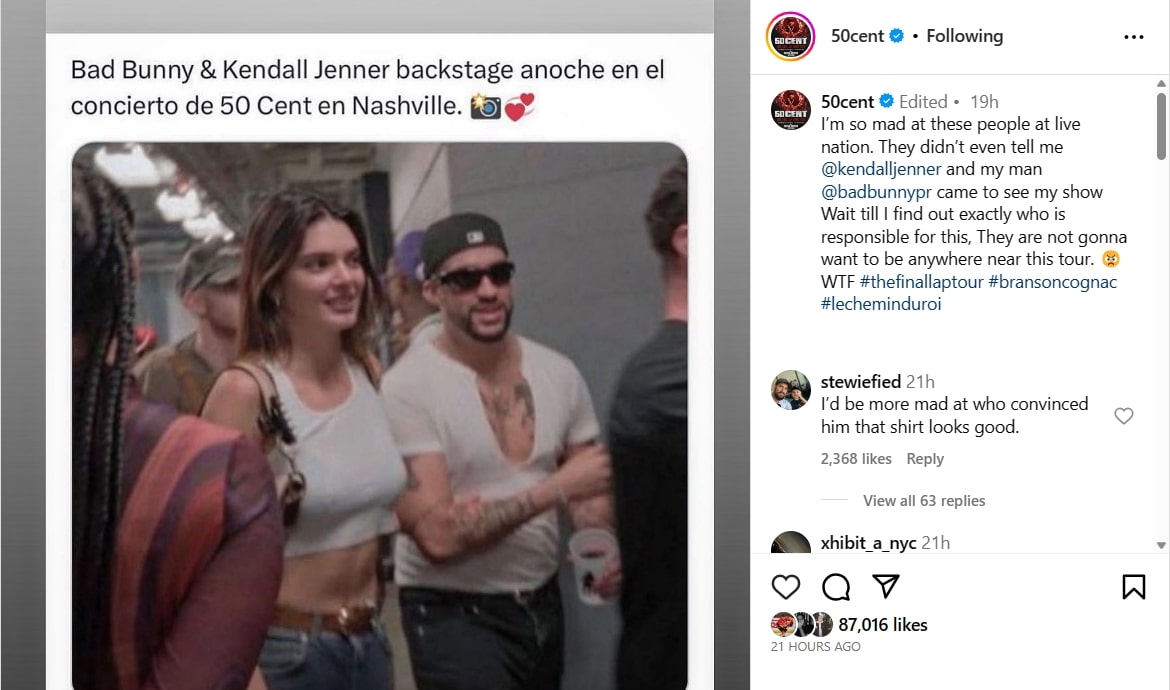 In a since-deleted Instagram post on Sunday (July 30), 50 Cent voiced his frustration with Live Nation due to the events promoter not telling him that Bad Bunny and Kendall Jenner were at his concert in Nashville, robbing him of the opportunity to meet with the celebrity couple.