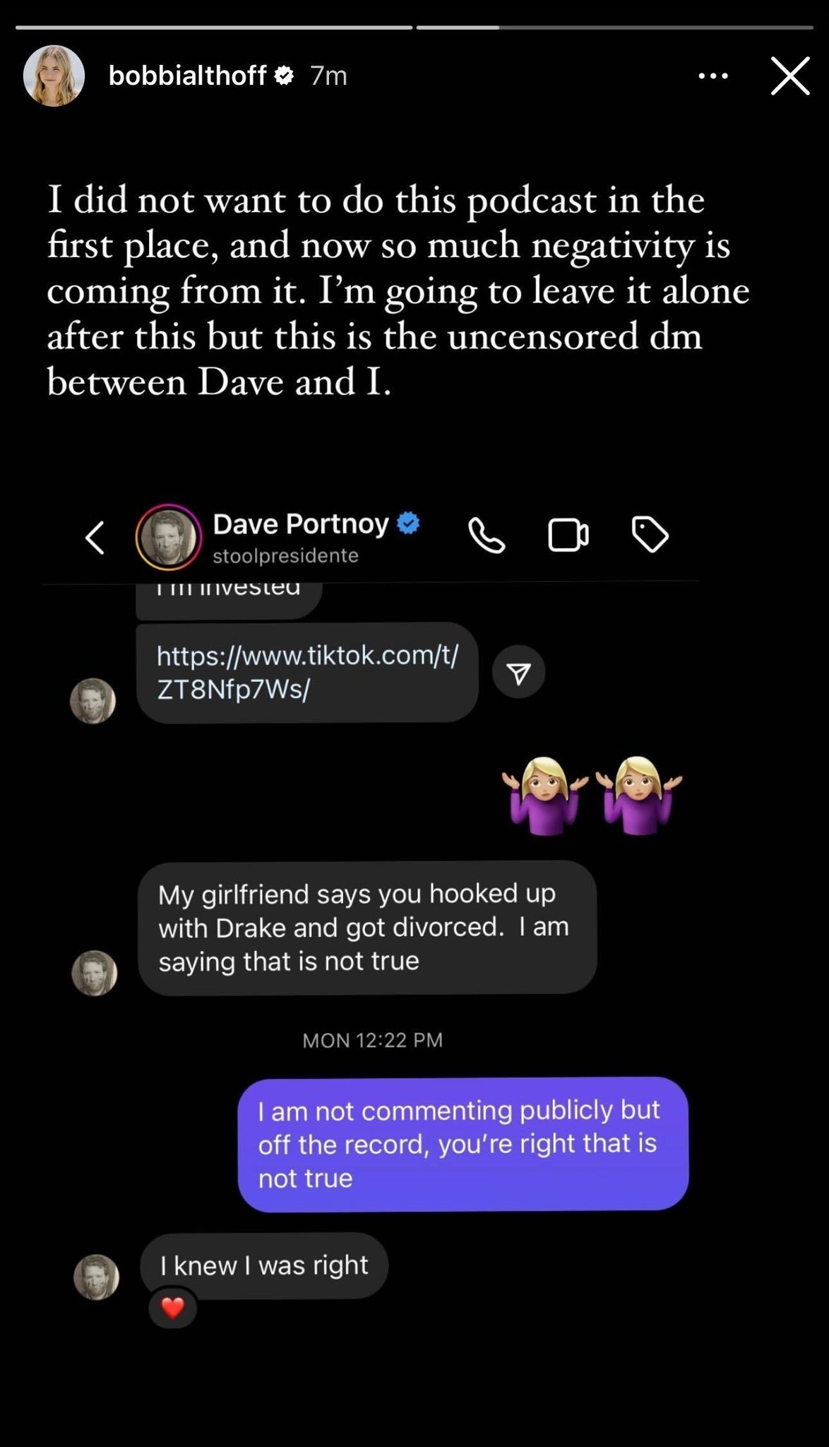 Bobbi posted the exchange on her Instagram Stories, where she further explained that she didn’t even want to appear on Portnoy’s BFFs podcast, which she did last week.