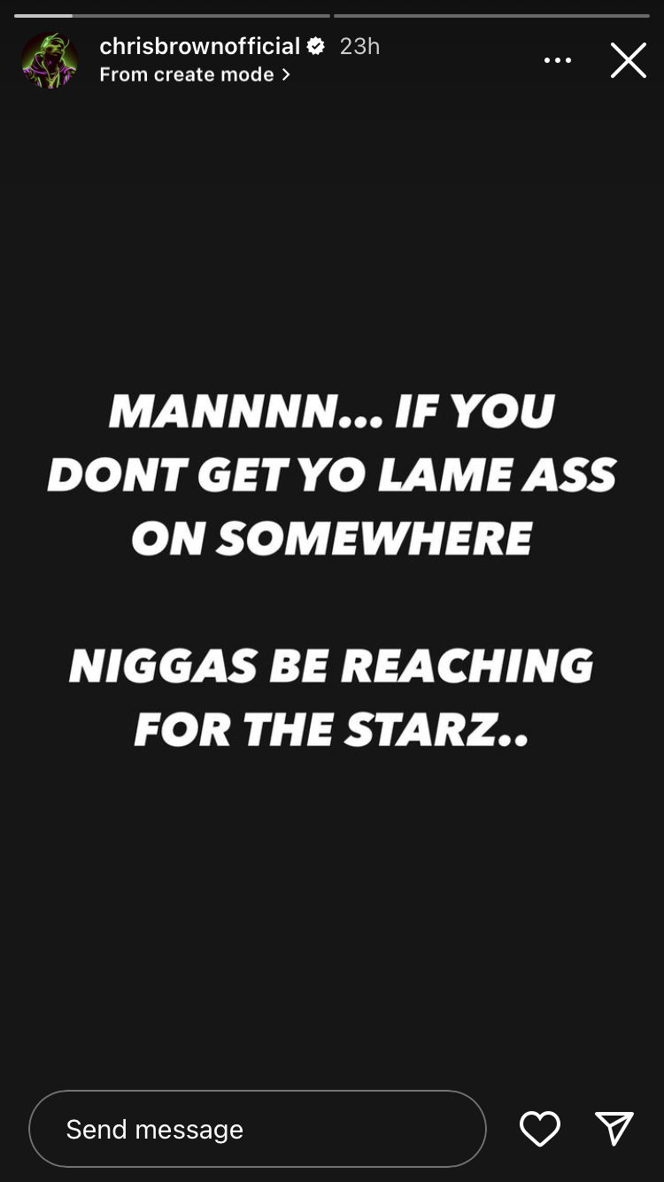 “MANNNN… IF YOU DON’T GET YO LAME ASS ON SOMEWHERE,” Brown vented in his all-caps post. “N-GGAS BE REACHING FOR THE STARZ.”
