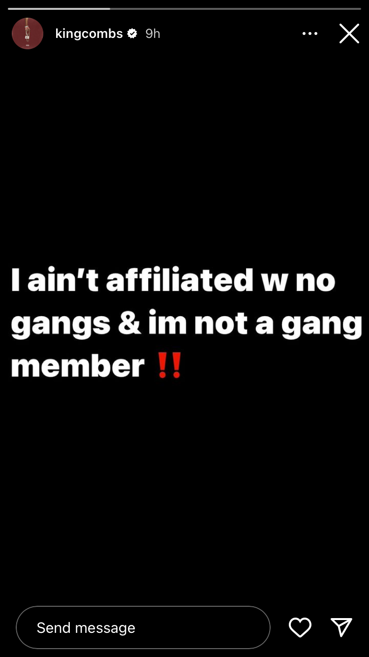 King Combs has since denied having any association with GDK, writing on his Instagram Stories: “I ain’t affiliated w no gangs & im not a gang member!!”