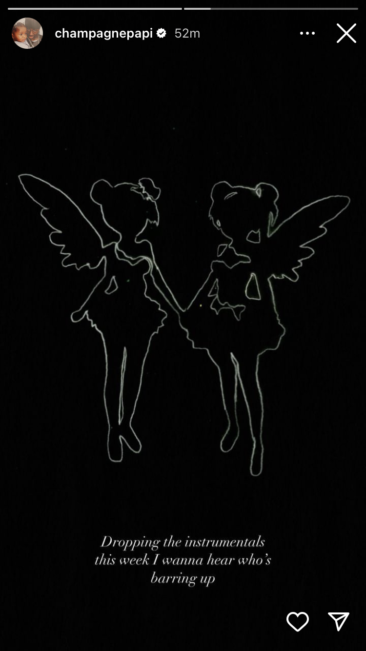 Writing on his Instagram Stories on Tuesday (November 21), Drake said: “Dropping the instrumentals this week I wanna hear who’s barring up” next to a graphic of the twin fairies that appear on his Scary Hours 3 cover.