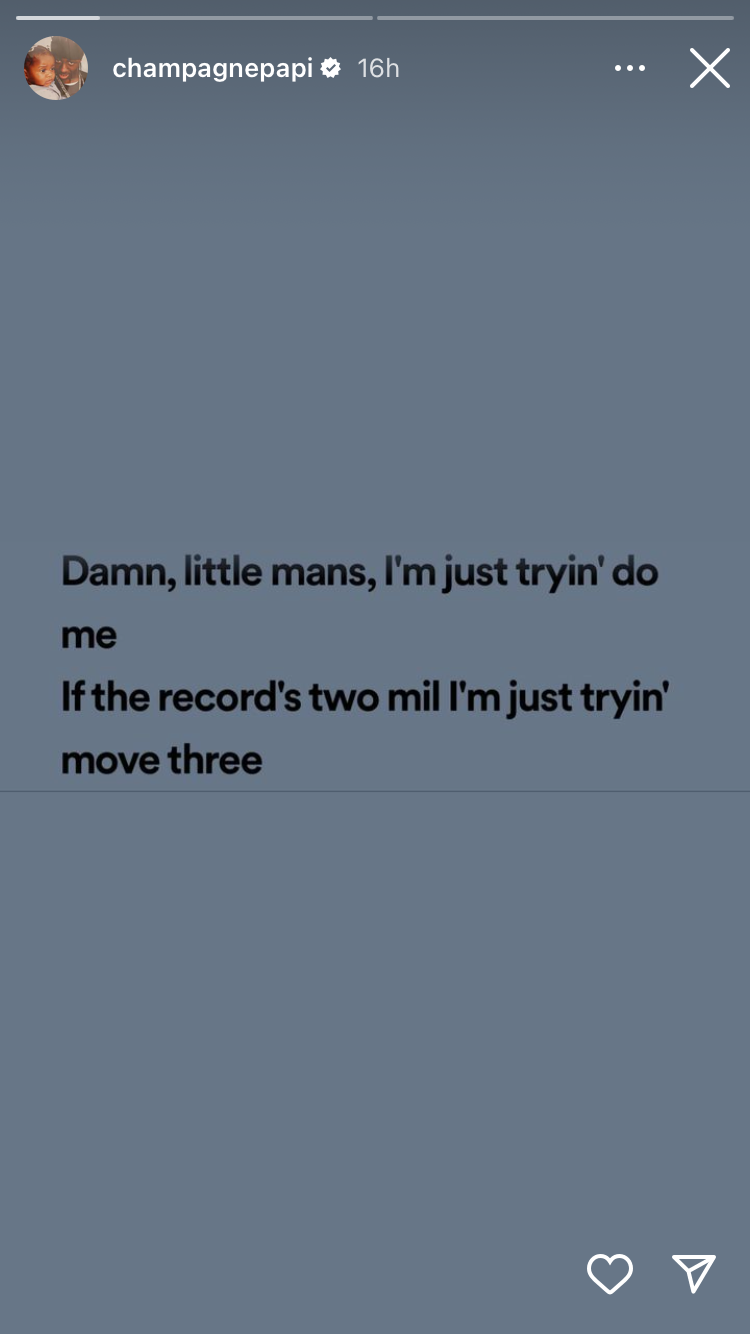 Drake appeared to fire back at Metro on his Instagram Stories by quoting the JAY-Z song “Heart of the City (Ain’t No Love)”: “Damn. little mans, I’m just tryin’ to do me/ If the record’s two mil, I’m just tryin’ to move three.”