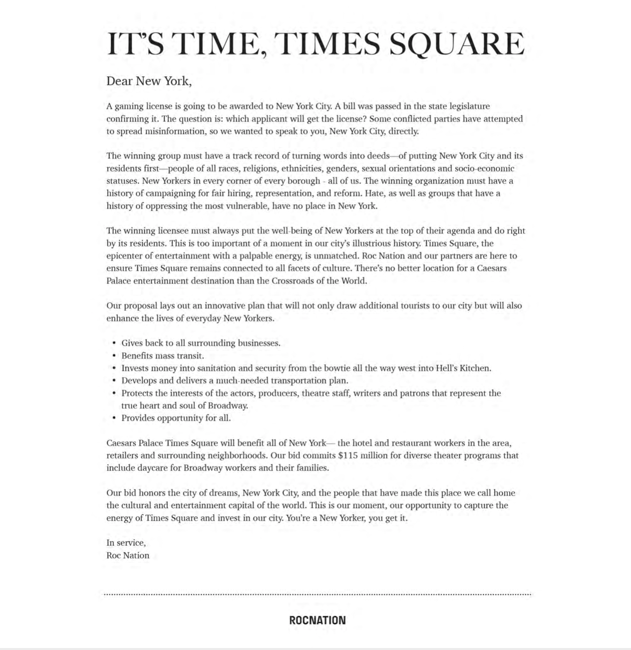 “This is our moment, our opportunity to capture the energy of Times Square and invest in our city. You’re a New Yorker, you get it,” Roc Nation’s letter concludes.