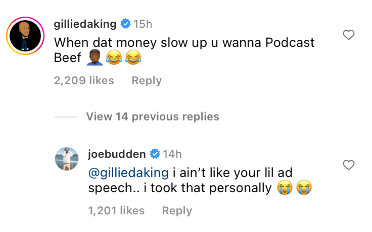 “When dat money slow up u wanna Podcast Beef [facepalm emoji] [crying face emoji],” Gillie commented on Akademiks’ post about Budden’s headboard insult.