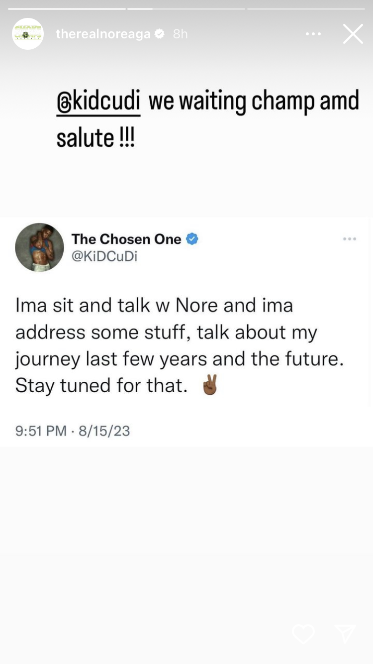 “@KidCudi we waiting champ and salute,” N.O.R.E. replied.