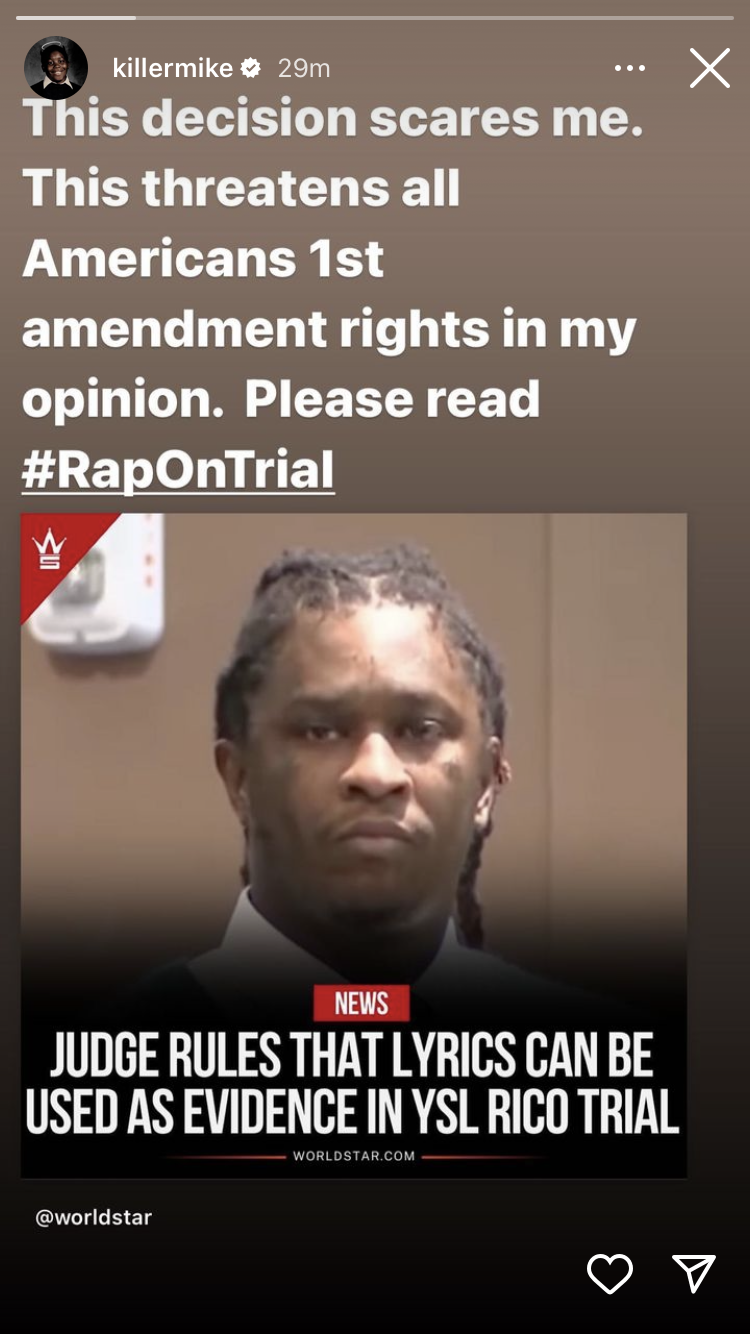 “This decision scares me,” wrote Mike, who is named on Young Thug’s witness list alongside the likes of T.I. and Lyor Cohen. “This threatens all Americans’ 1st Amendment rights in my opinion. Please read #RapOnTrial.”