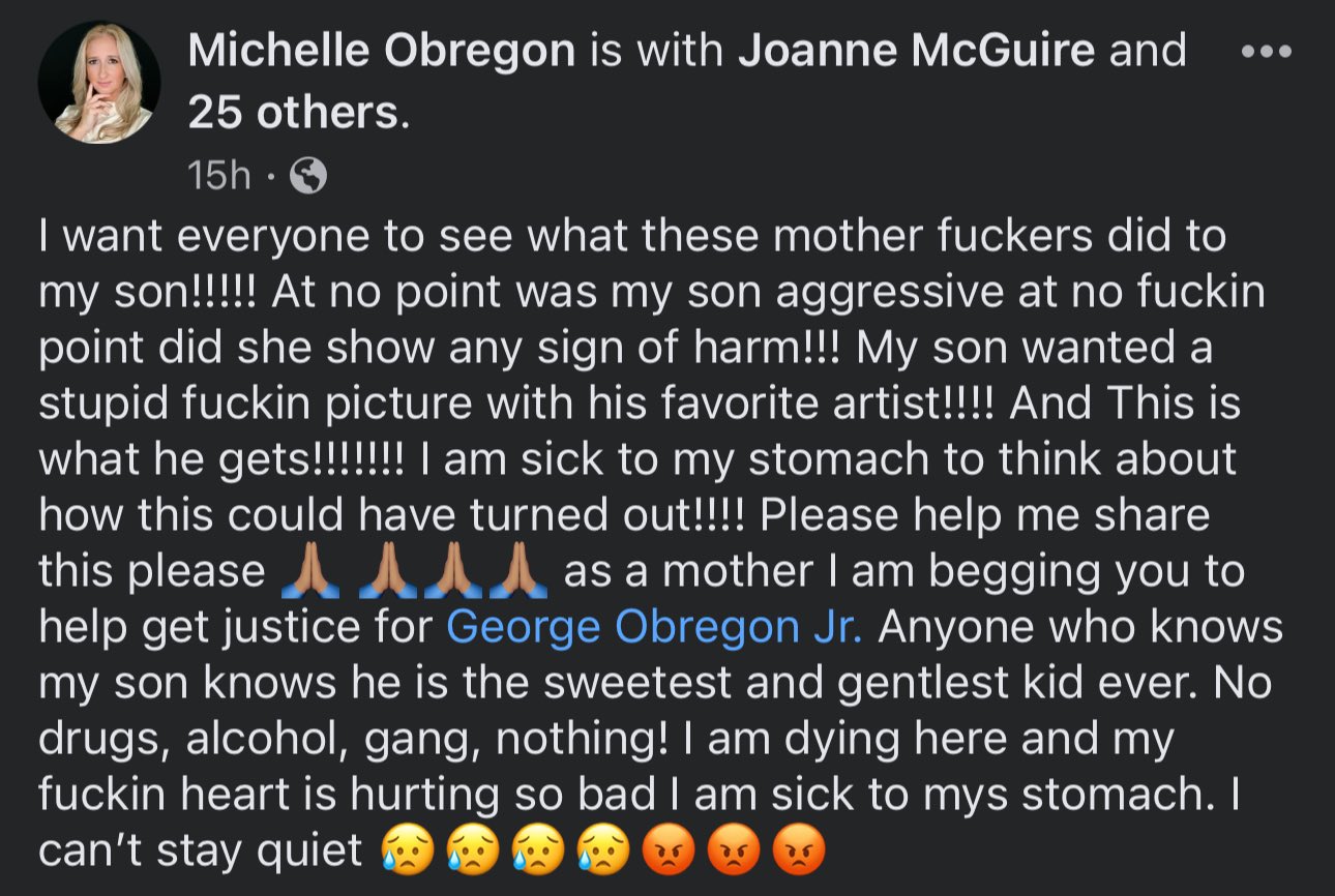 “I want everyone to see what these mother fuckers did to my son,” she began. “At no point was my son aggressive at no point did he show any sign of harm!!! My son wanted a stupid fuckin picture with his favorite artist !!! And This is what he gets!!! I am sick to my stomach thinking about how this could have turned out!!!”