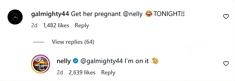 In the comments sections, a fan brazenly wrote: “Get her pregnant @nelly [laughing emoji] TONIGHT!!” to which the Grammy-winner succinctly replied: “I’m on it” along with a salute emoji.