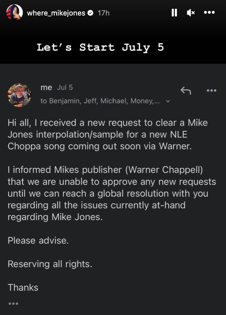 “Hi all, I received a new request to clear a Mike Jones interpolation/sample for a new NLE Choppa song coming out soon via Warner,” the email read.